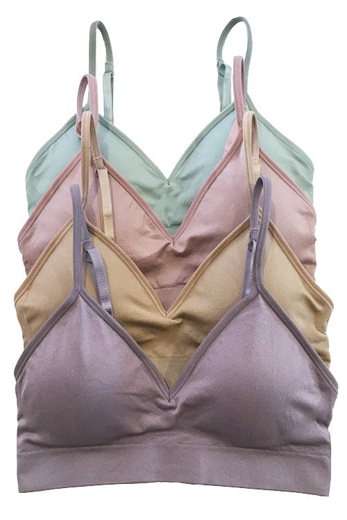 Very feminine seamless sport bra. Plunging V shape neckline with adjustable straps capable of crossing in the back, and removable cups.