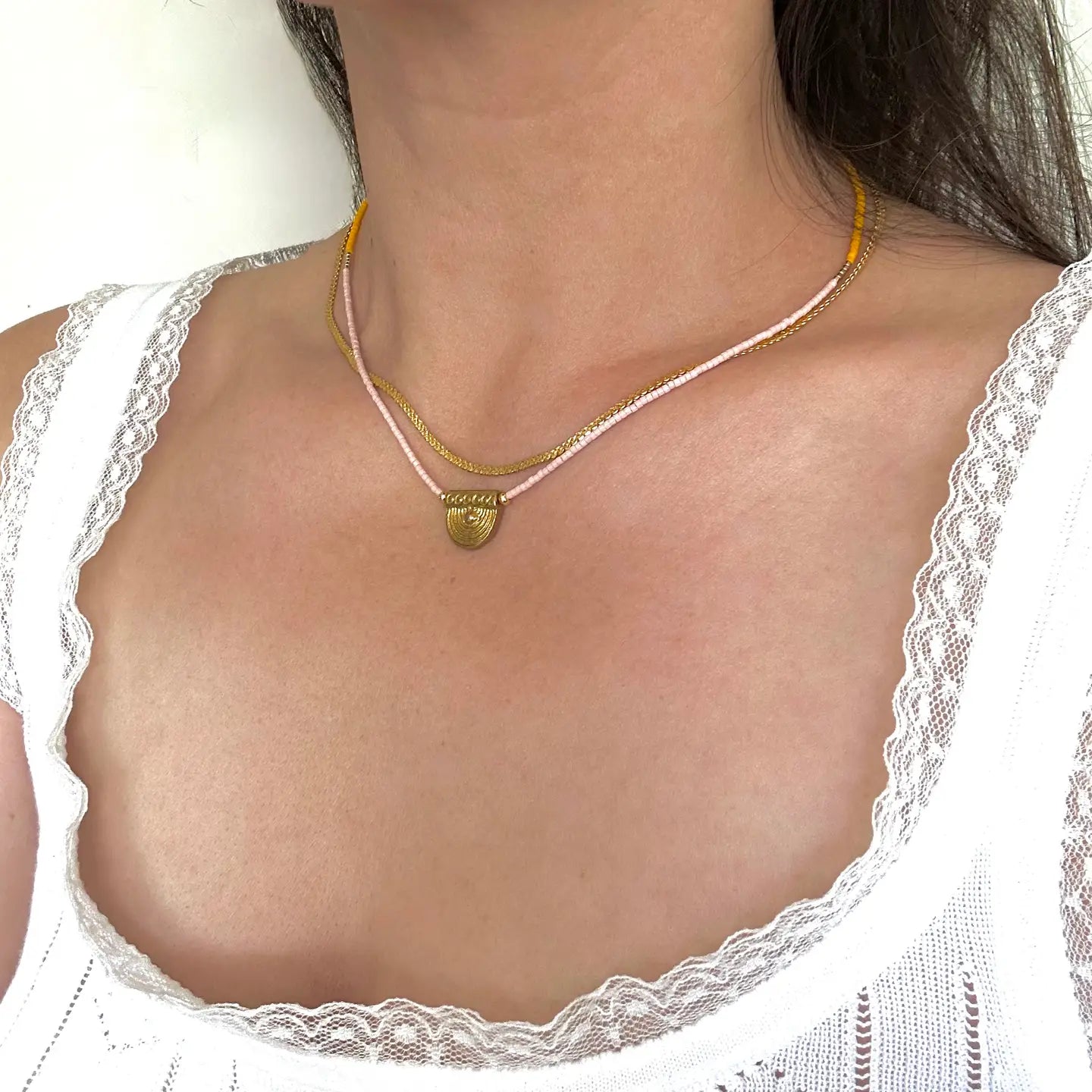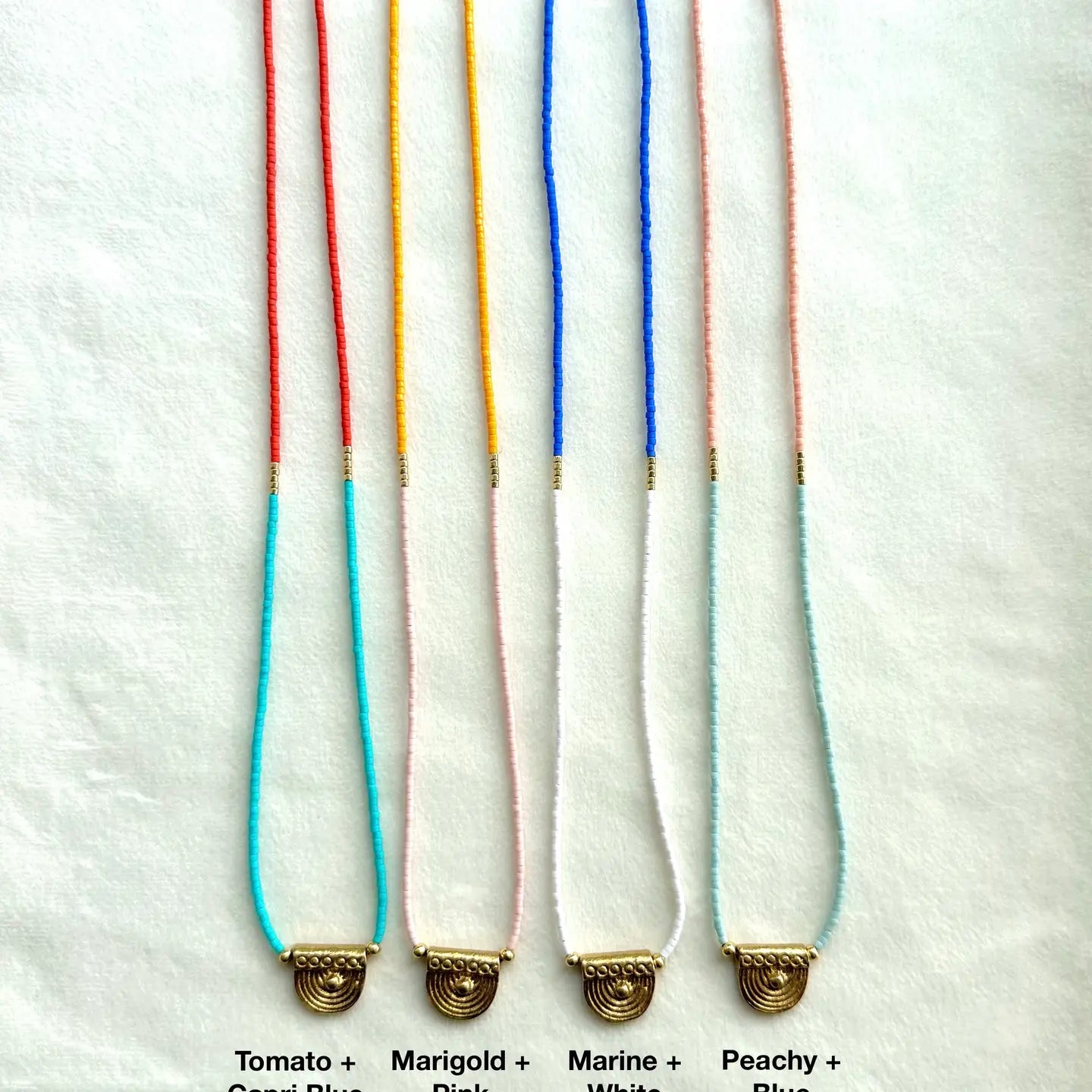 Evoking the golden light of coastal villages and sun-soaked markets, the Mallorca Necklace brings a touch of wanderlust to your everyday look. Each necklace is hand-strung with delicate Japanese glass seed beads in a palette reminiscent of terracotta rooftops, turquoise waters, and whitewashed walls. At the center is a hand-cast brass pendant - a half-moon sun motif that feels both ancient and timeless. Lightweight and easy to wear, it layers beautifully or makes a subtle statement on its own.