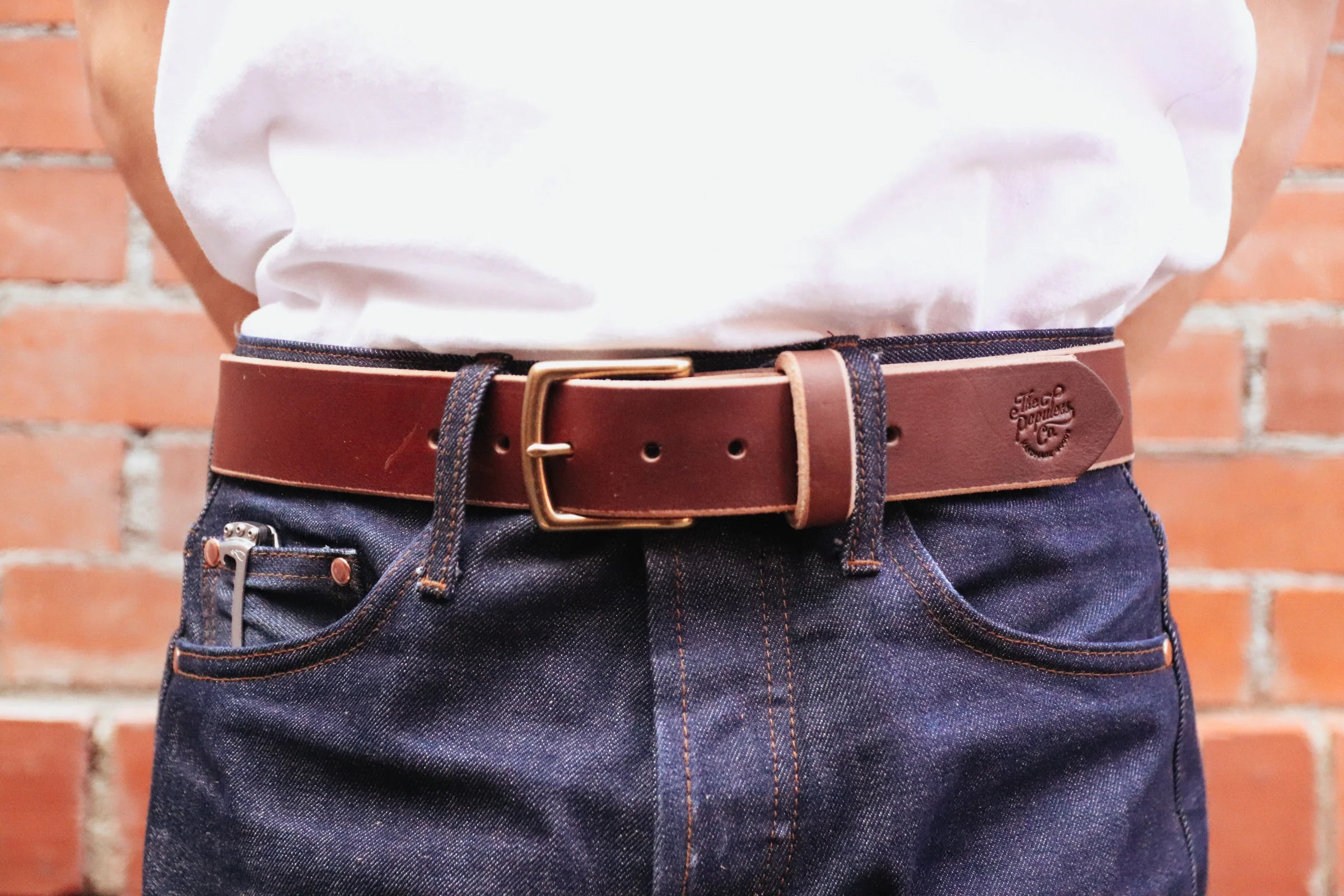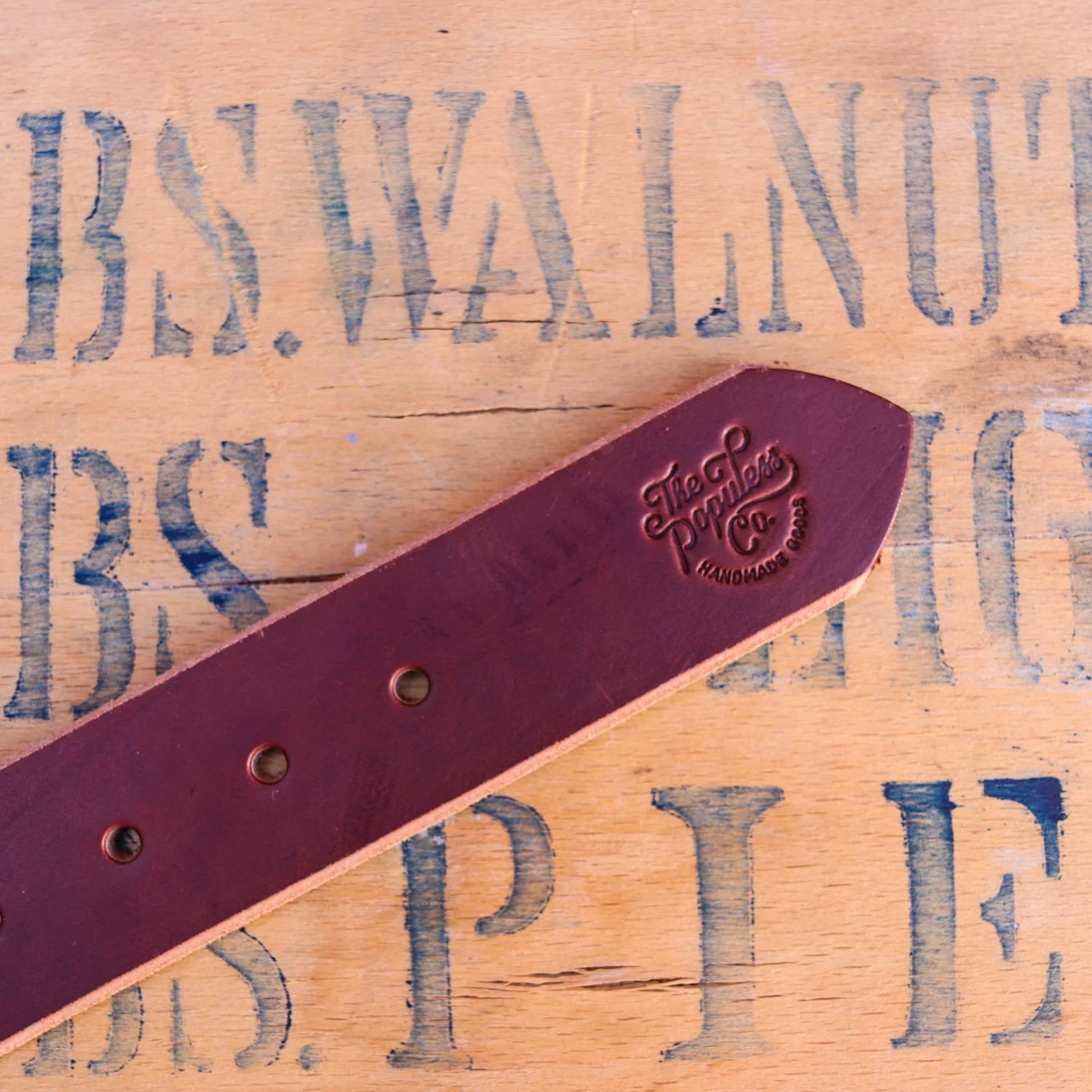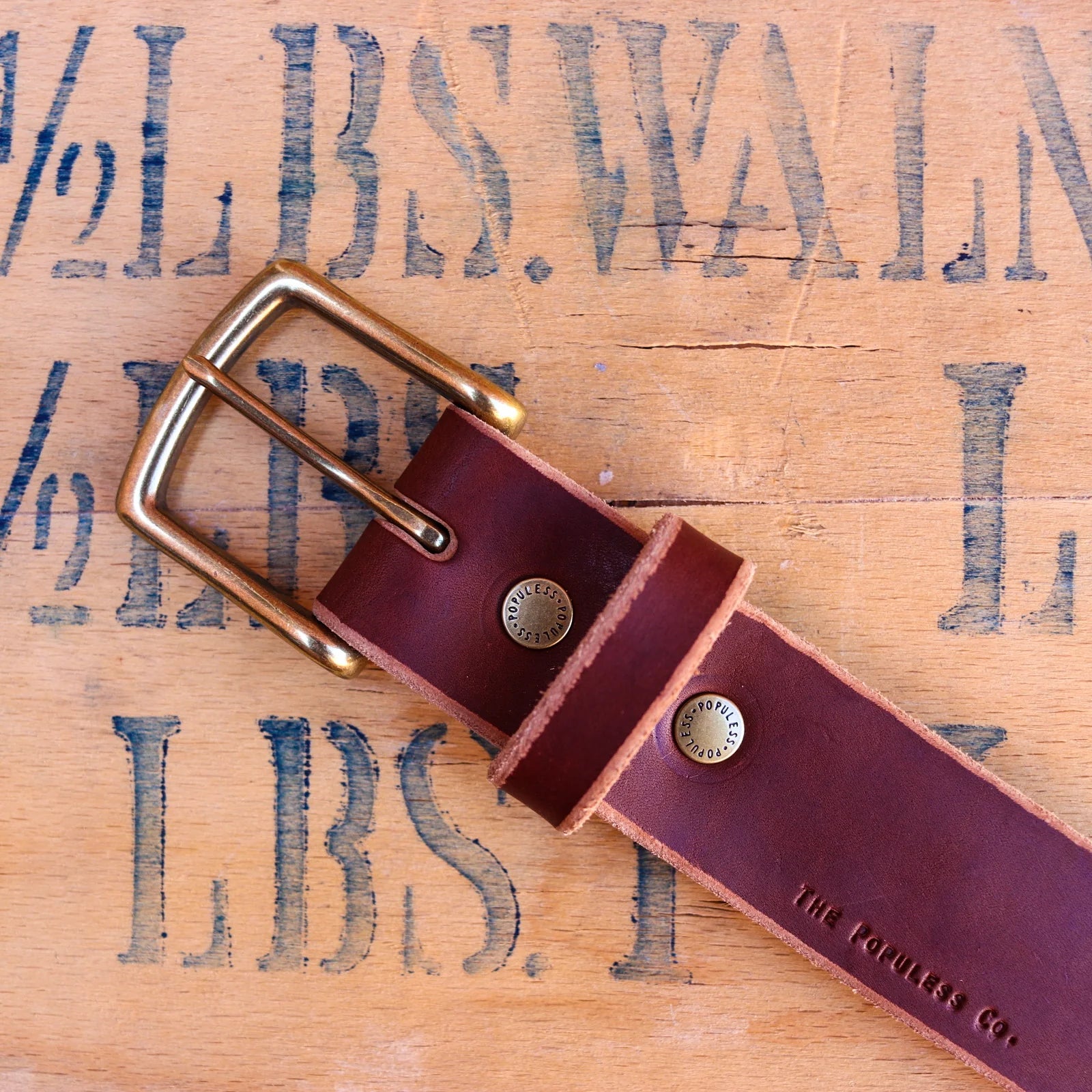 The Keho Belt 1.5" width (standard) timeless design, cut from 10/12oz Latigo Leather. There is some variance between belt thicknesses. We use a heavier weight leather so your belt will be able to handle anything you through its way. These belts have a stiff rigidity to them right away and in time with wear break in beautifully.  Used for quality, durability and built for your journey. "The Populess Co." embossed on the tip. Note each piece of natural leather we use has its own characteristics and imperfections, just like the people that surround us.