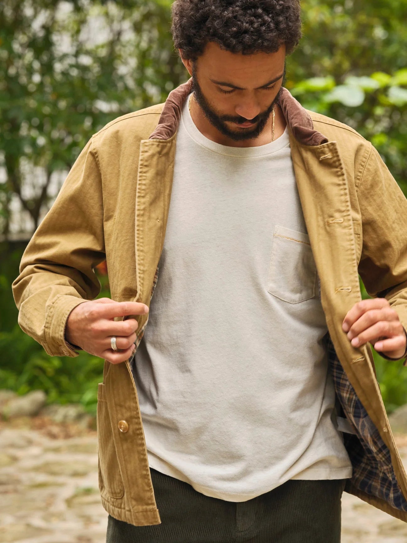 The fit is comfortably roomy. The fabric is washed herringbone twill with a plaid flannel lining and a corduroy collar. It features our signature hidden pockets behind the classic patch pockets (perfect for warming your hands on cooler days) and an inside left-chest pocket.