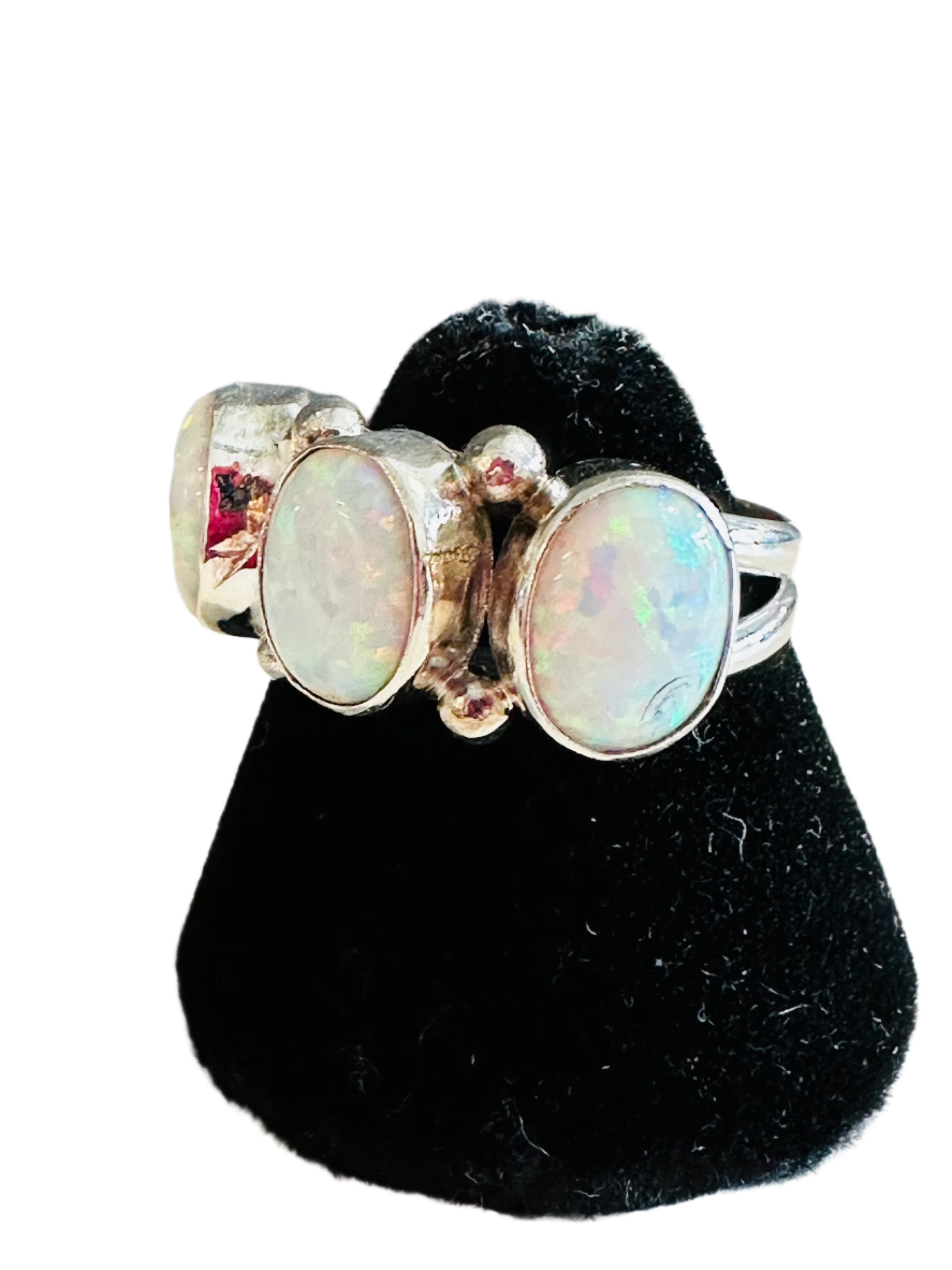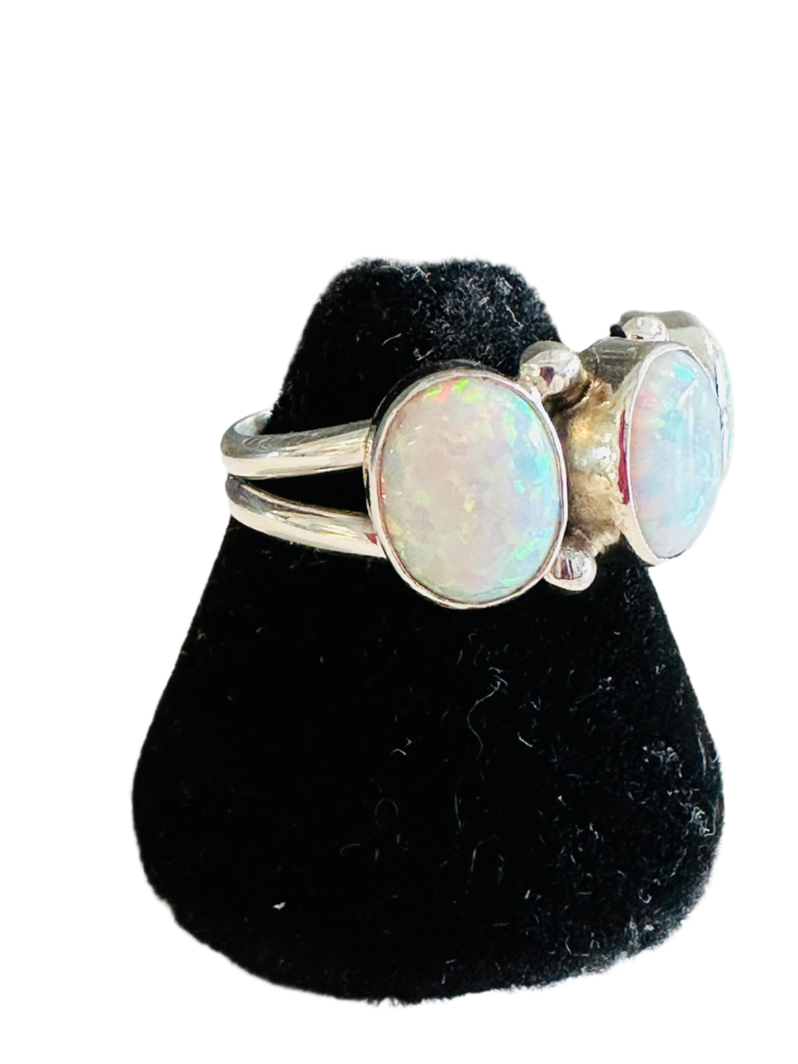 Sterling silver ladies ring with 3 - 7x9mm white opal stones set in plain bezel with silver drops in between on a double wire split shank.