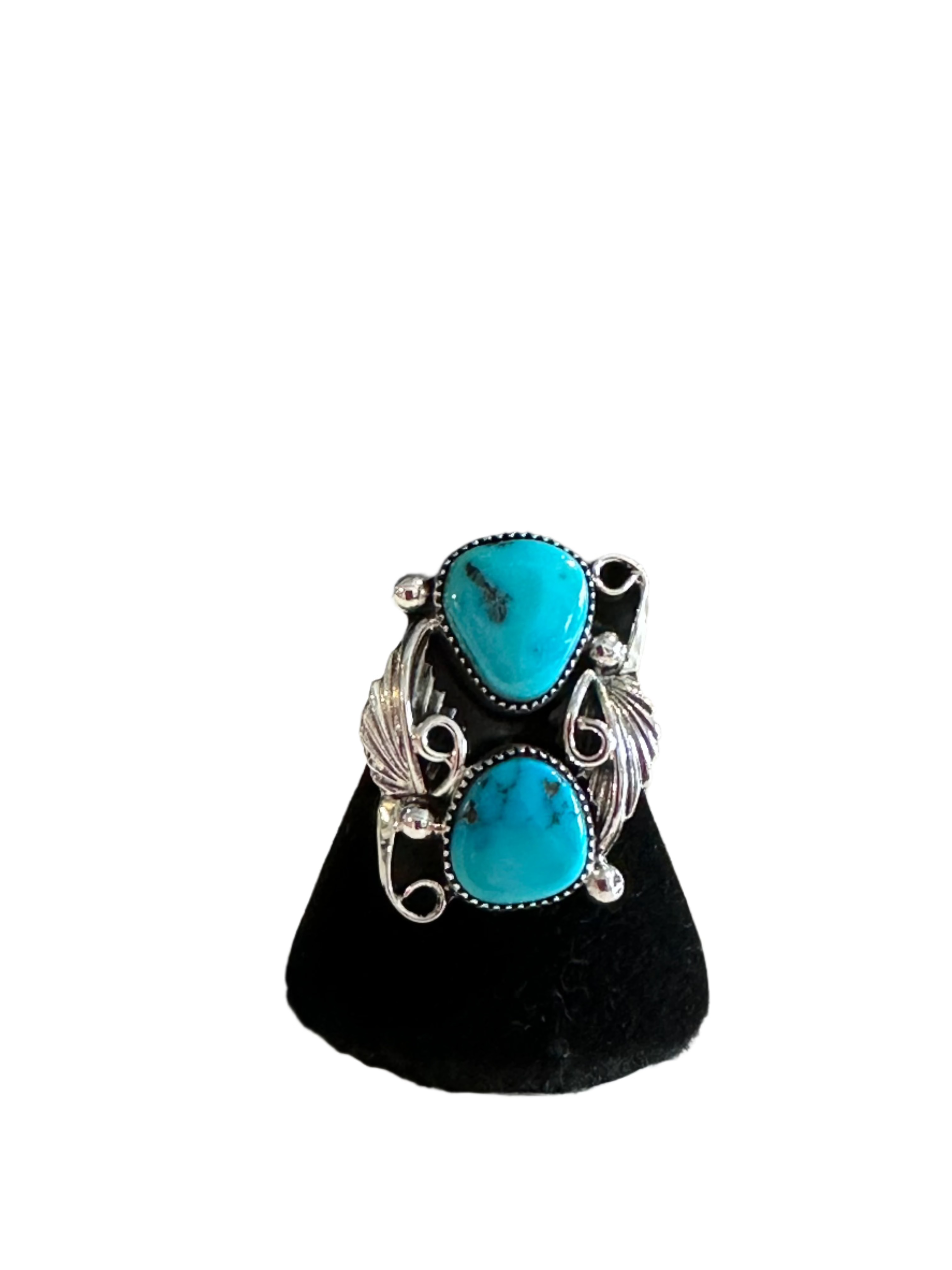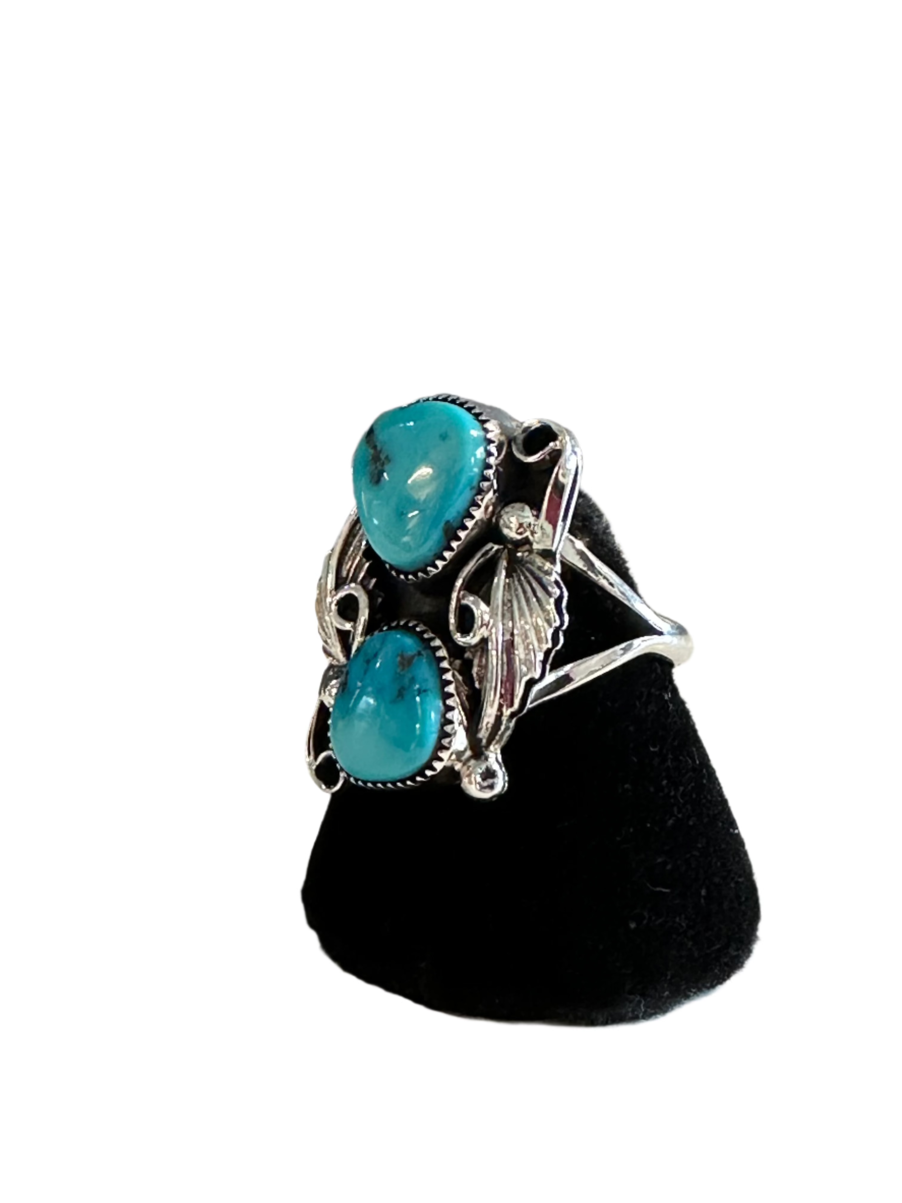 Sterling silver women's ring with two free form turquoise stones and two cast leaves, Q's, drops and is set on single split shank.