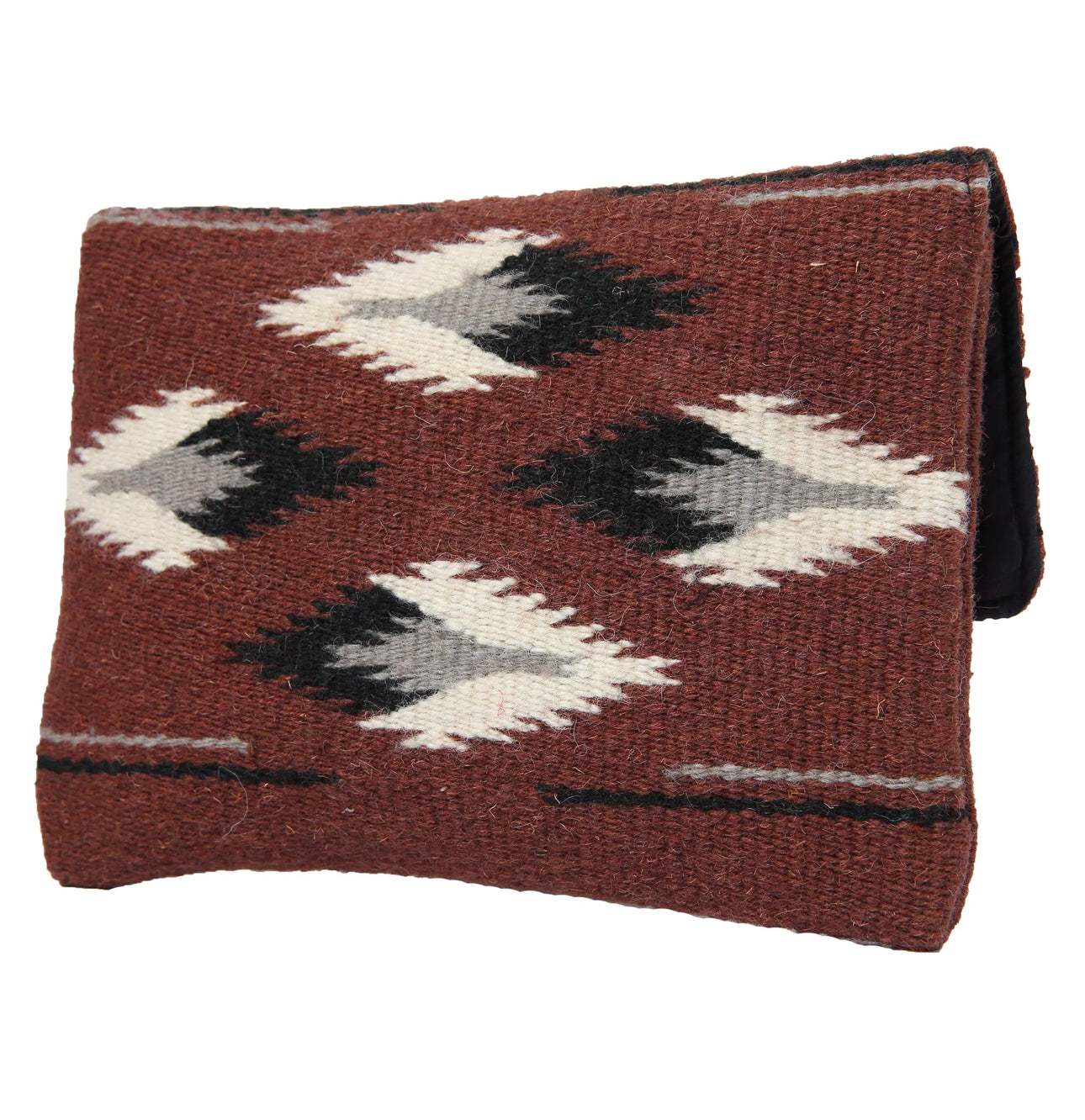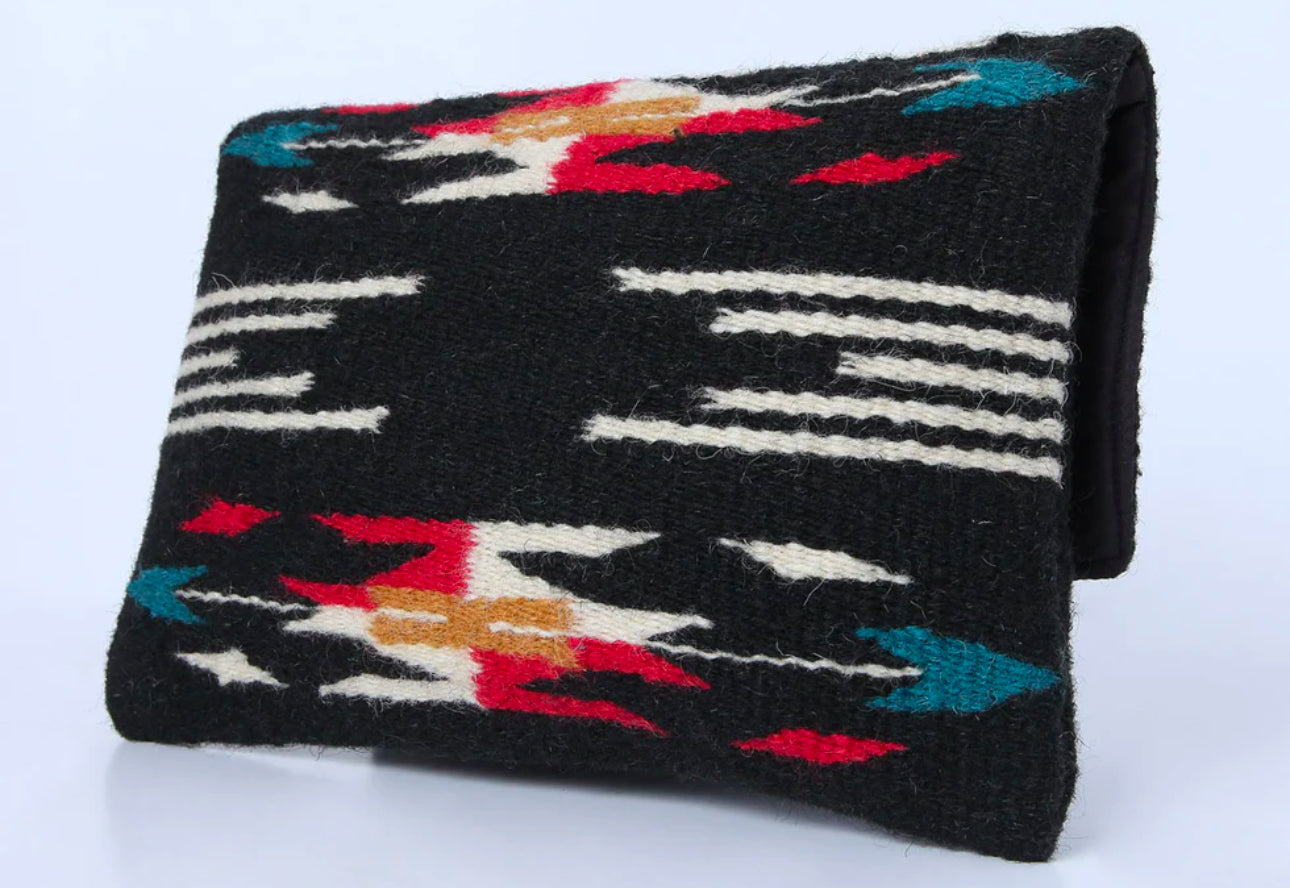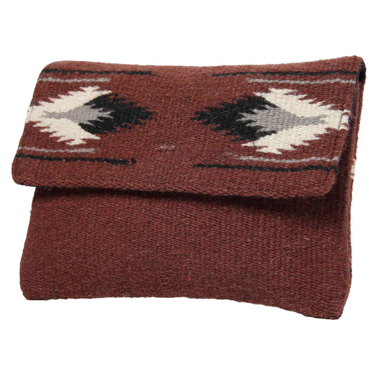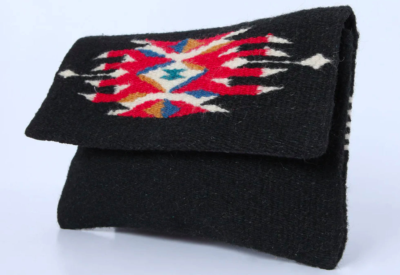 Handcrafted wool clutch purse with intricate Chimayo-style designs on both front and back. Has a magnetic snap closure and has a fully lined interior with an inside zippered pocket.