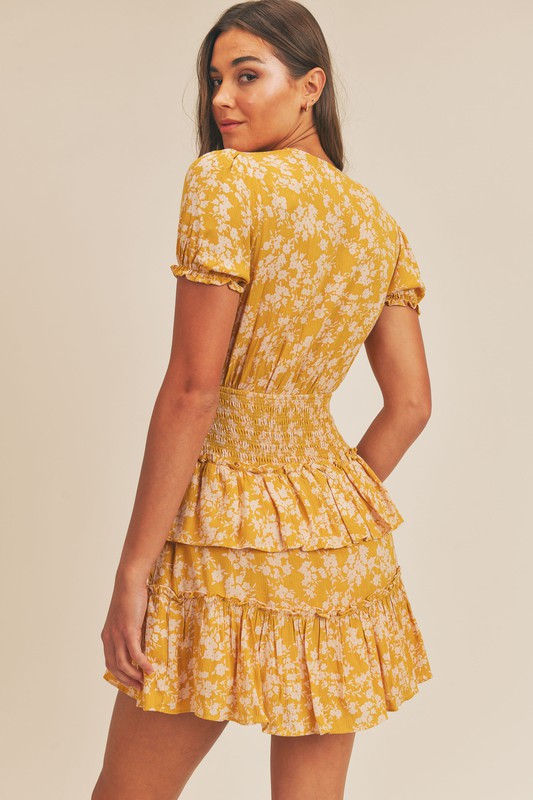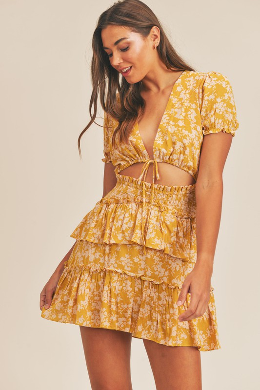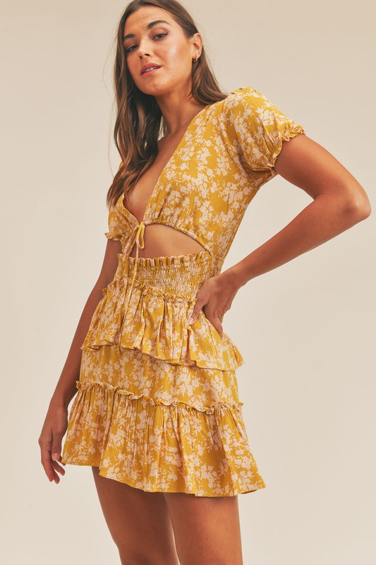 A mustard floral ruffle mini dress with the cutest front cutout. Perfect for any summer occasion.