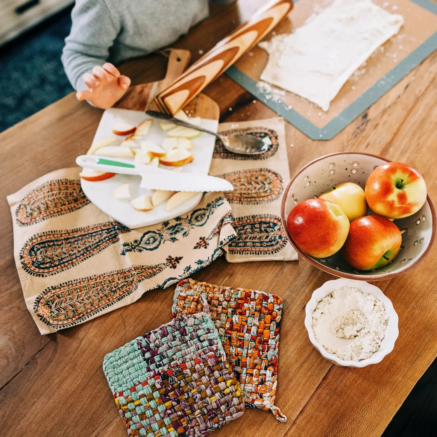 Recycle, repurpose, recreate. Artisans of Prokritee in Bangladesh make new hand-woven hot mats for your kitchen, using recycled sari cloth from the subcontinent. Cotton cloth of many colors. Set of 3 hot mats wrapped with ribbon makes a lovely gift.