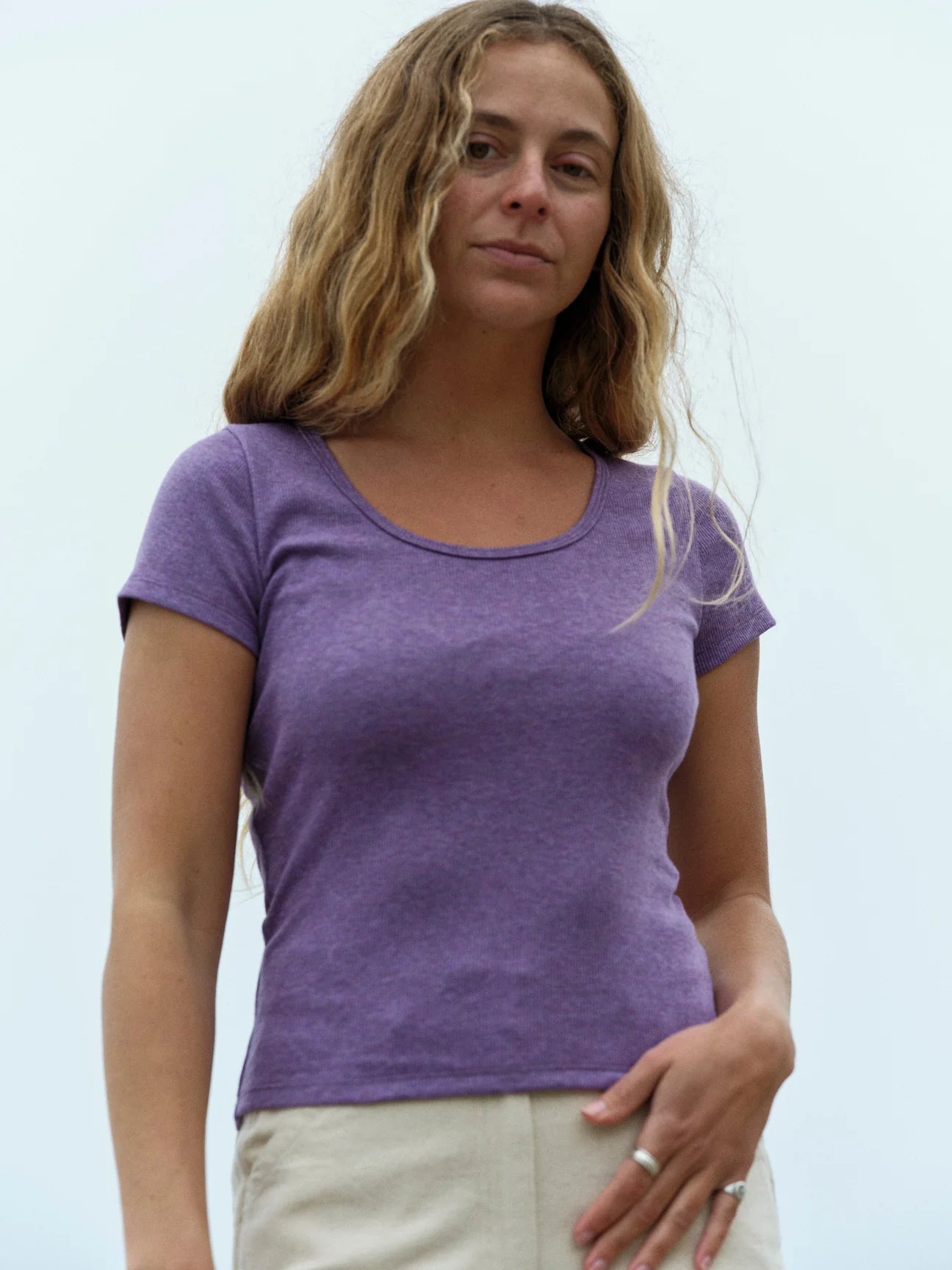 A scoop-neck 90's baby tee in a super soft tri-blend rib. The fit is close to the body. Alana is 5'6" tall and wearing size S.