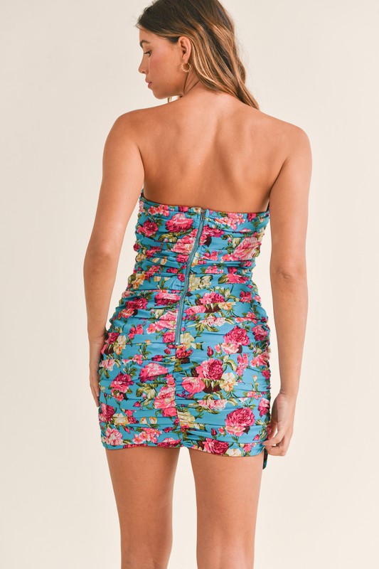 A statement dress for your summer event! We love the popping turquoise floral with front ruffle detail. Ruched for a flattering fit.