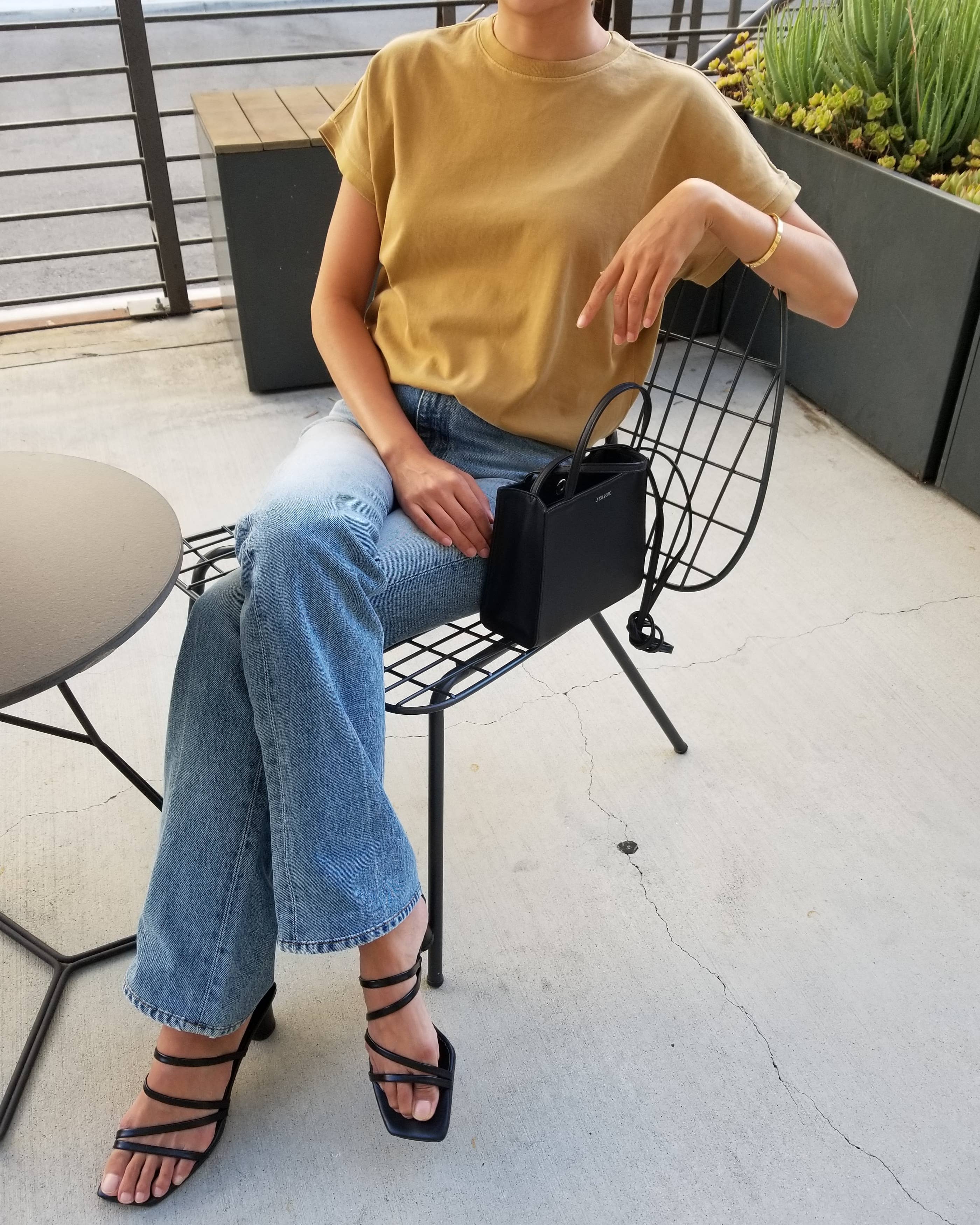 Ease Tee is an edgy dolman tee. She features a high crew neck, shoulder coverage without a sleeve, slightly rounded hem and a contrast rib banded sleeve opening and neck opening. With a crisp color palette and enough length to tuck in or out she is a cool girl's uniform.