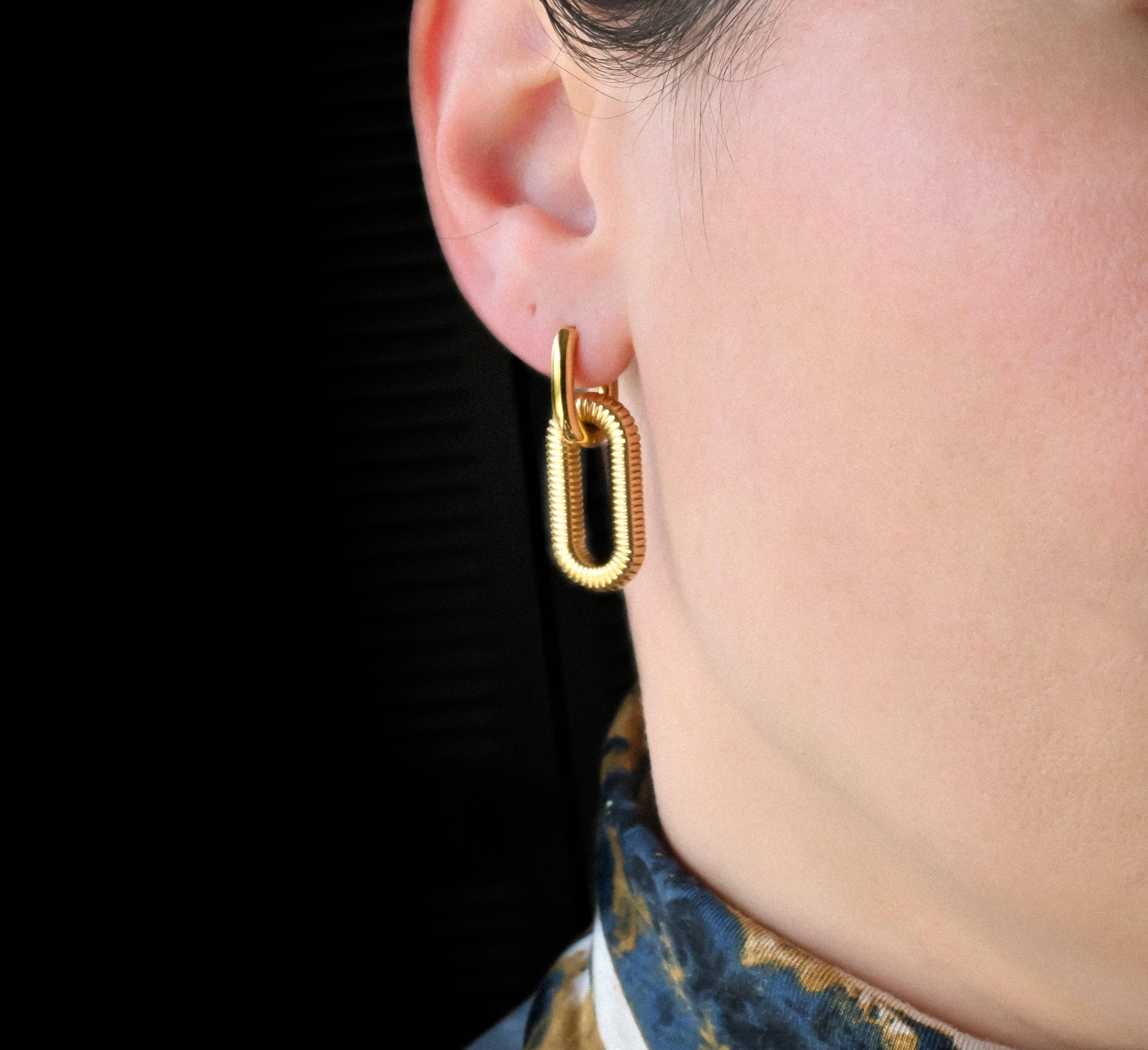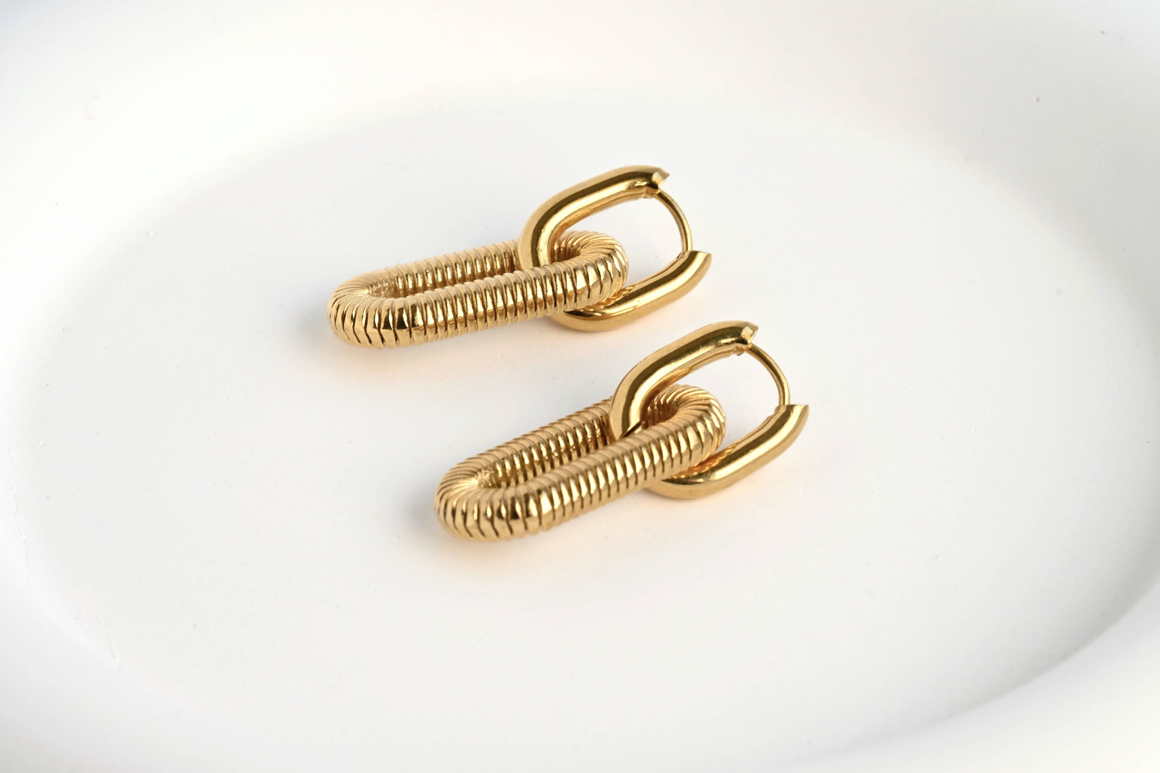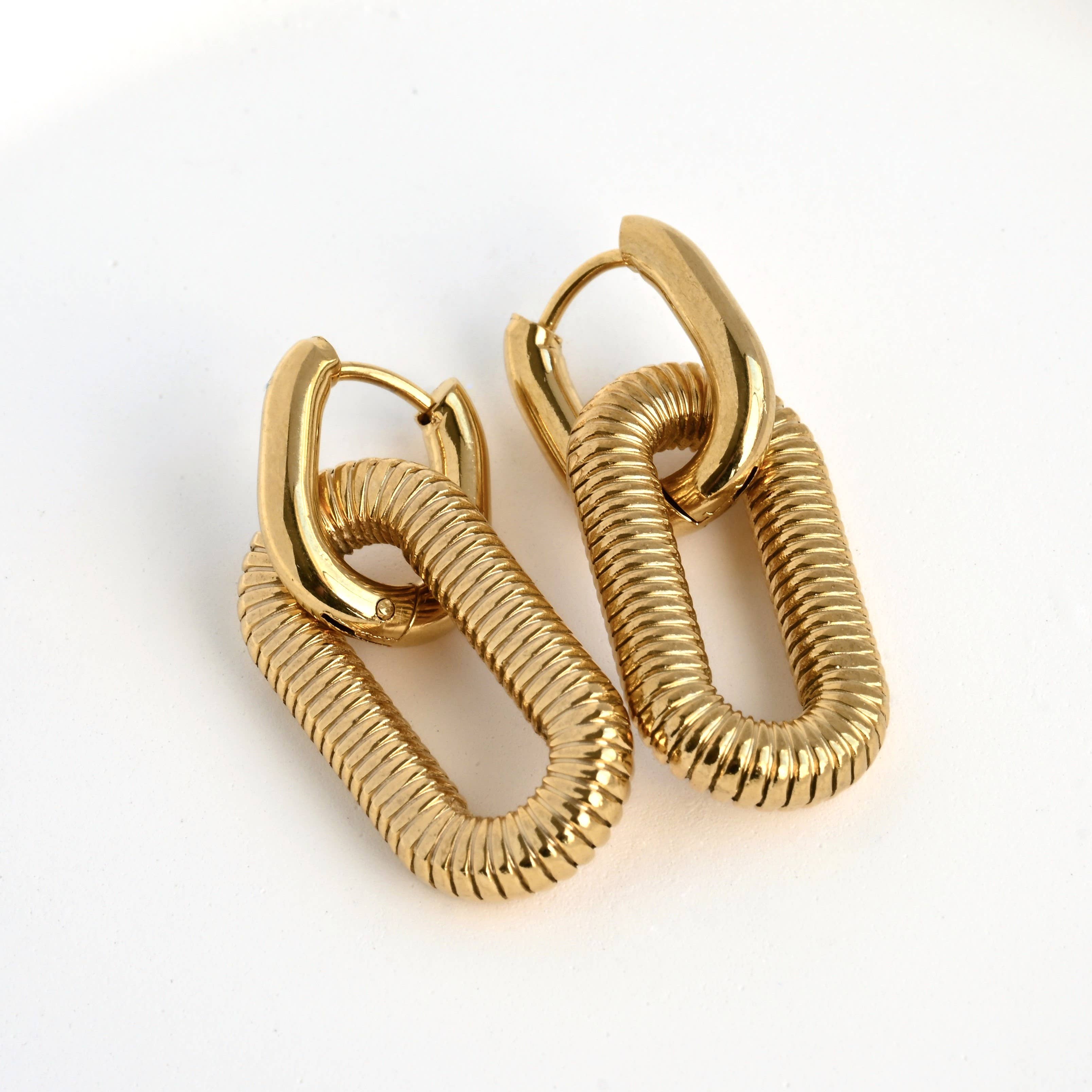 These drop link hoops are crafted in 18k Gold PVD plated stainless steel. The design features a link hoop, which can be worn on its own or linked with a slightly bigger textured link. Plus, they are tarnish resistant and waterproof!
