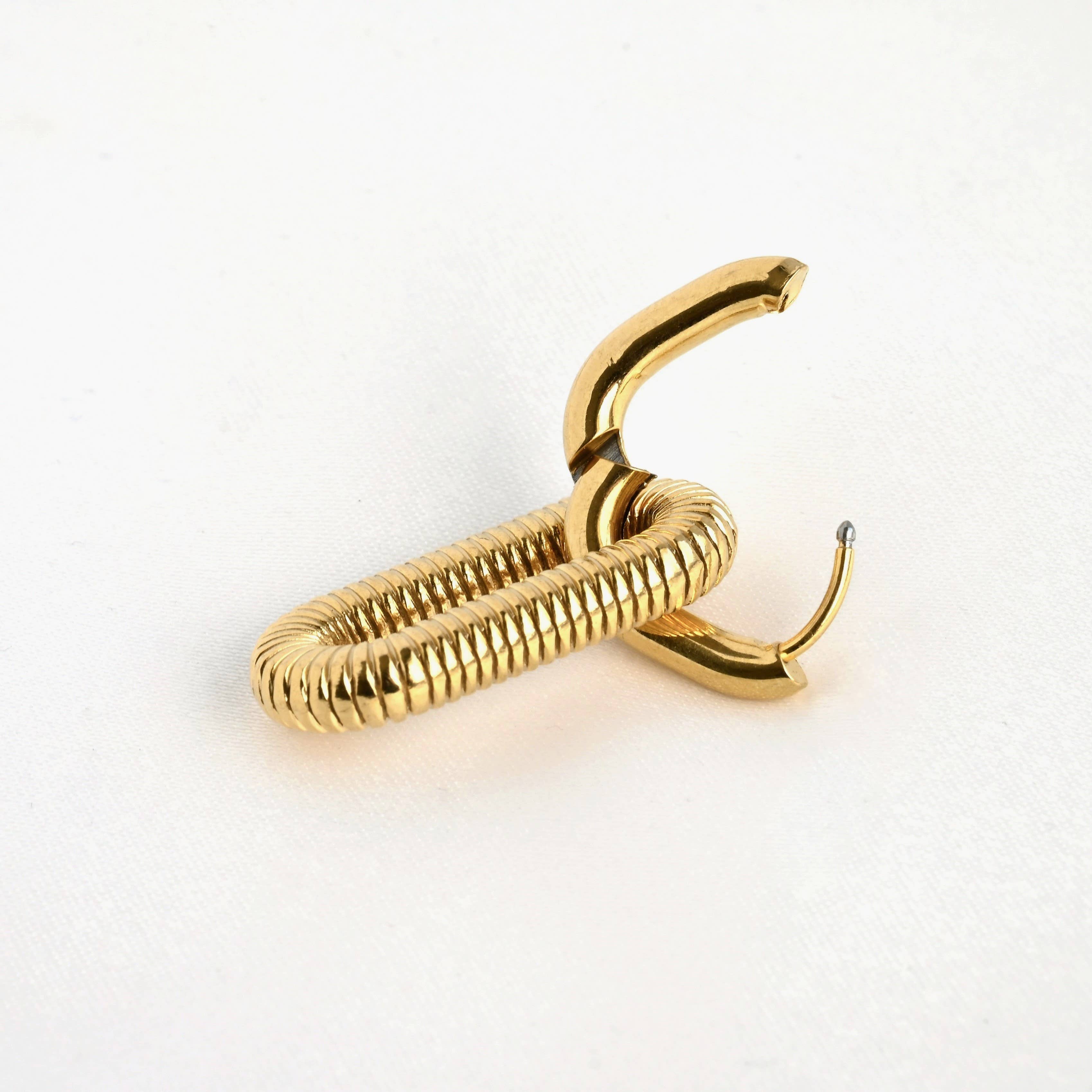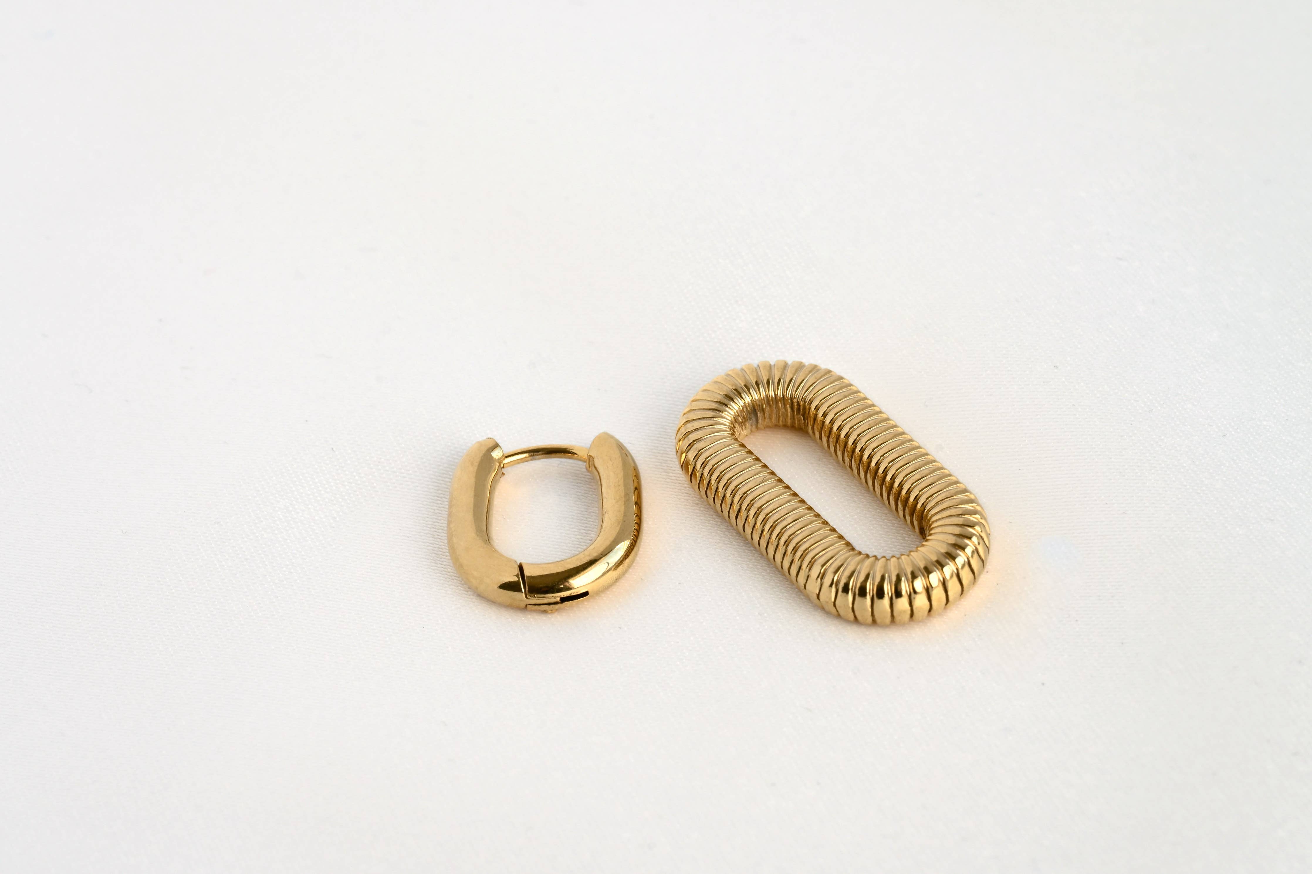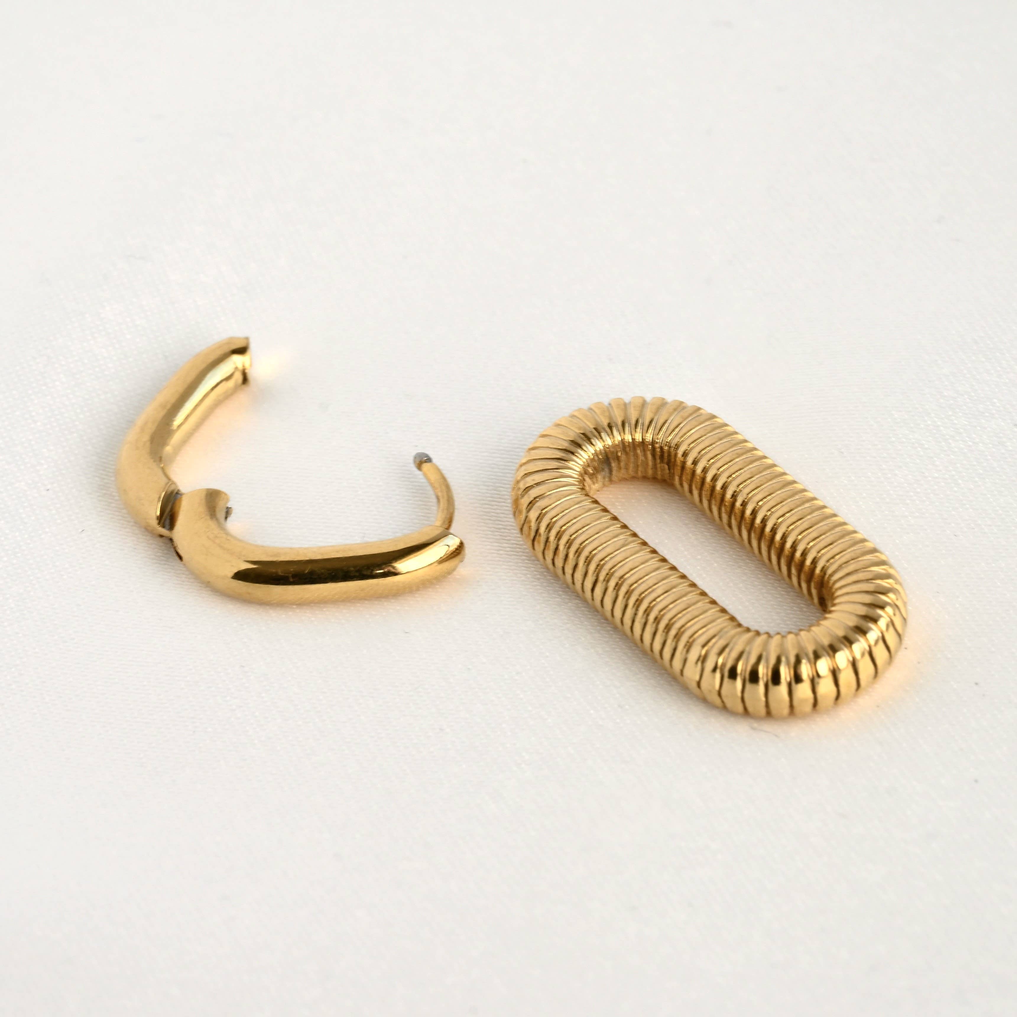 These drop link hoops are crafted in 18k Gold PVD plated stainless steel. The design features a link hoop, which can be worn on its own or linked with a slightly bigger textured link. Plus, they are tarnish resistant and waterproof!