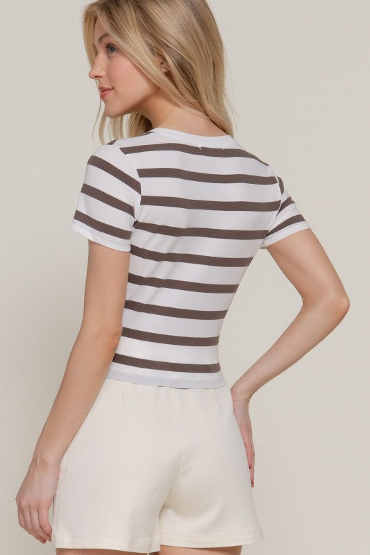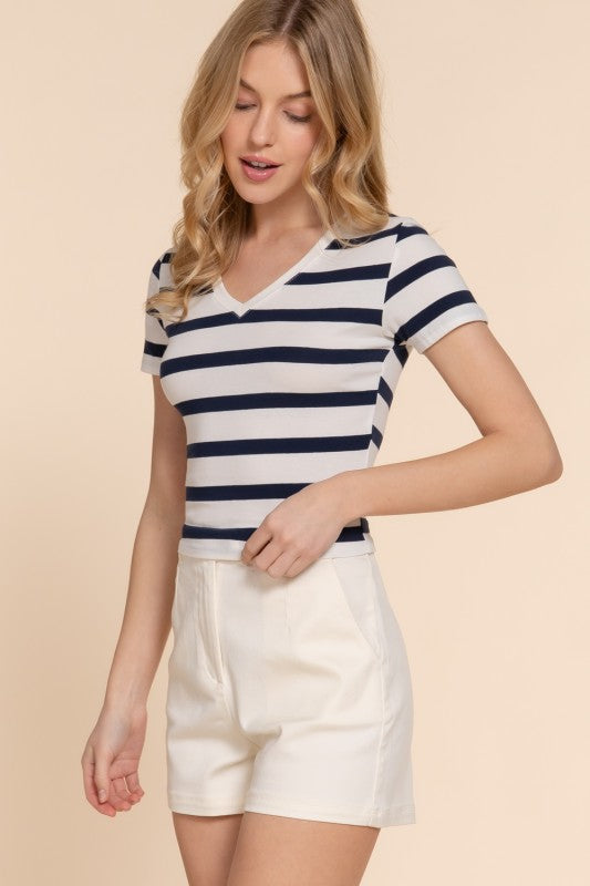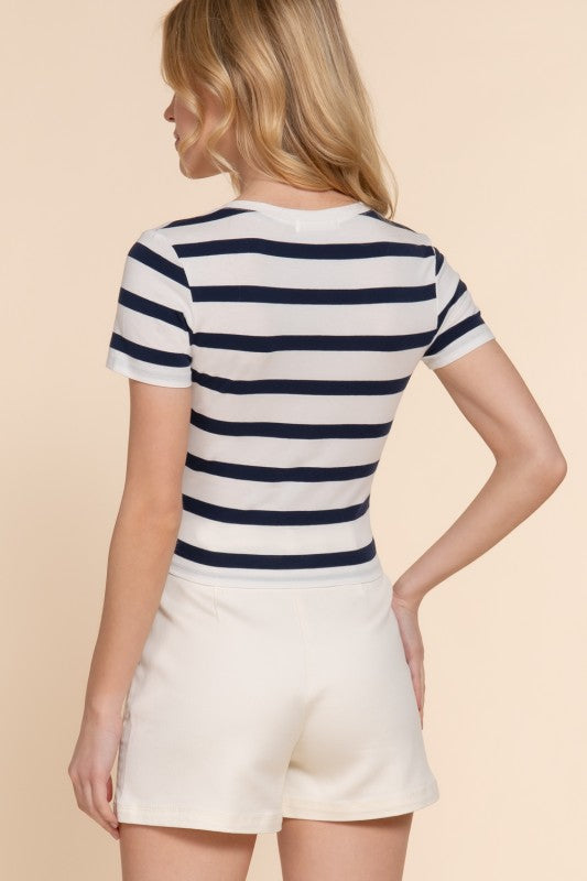 A classic stripe not so cropped tee. Pairs great with any high rise bottom and the classic stripe is never out of style.