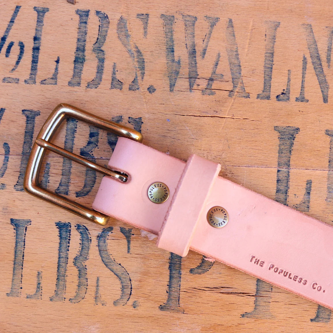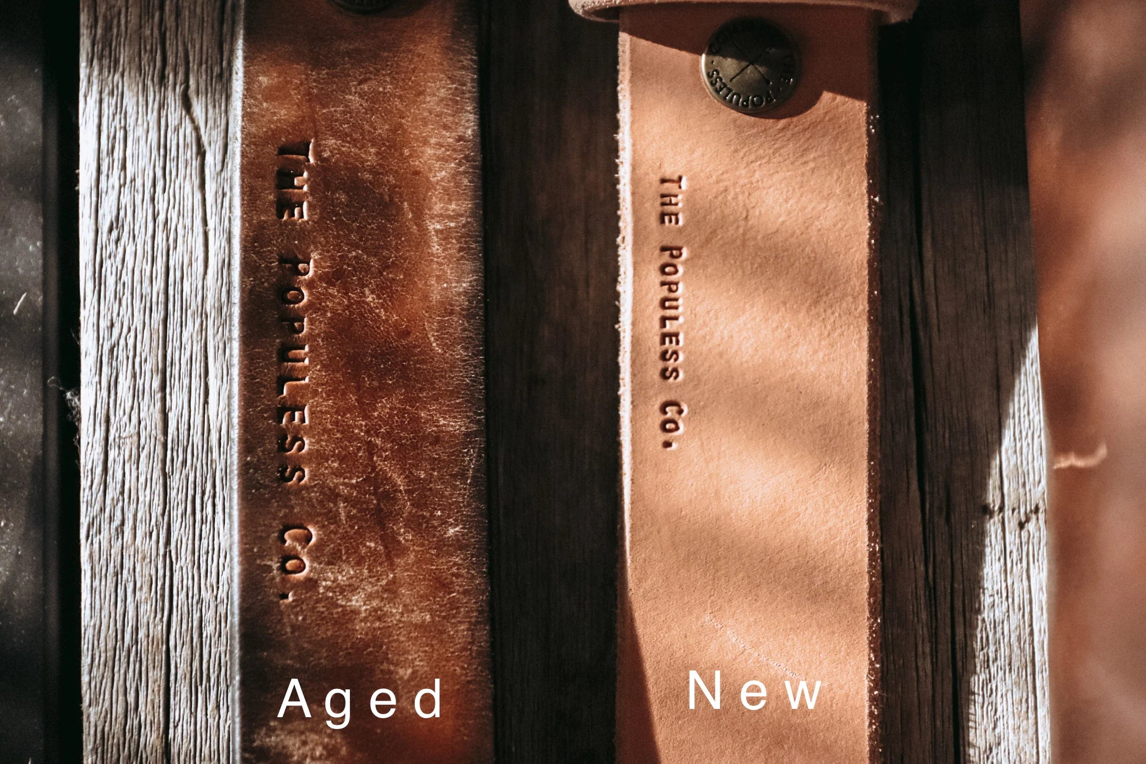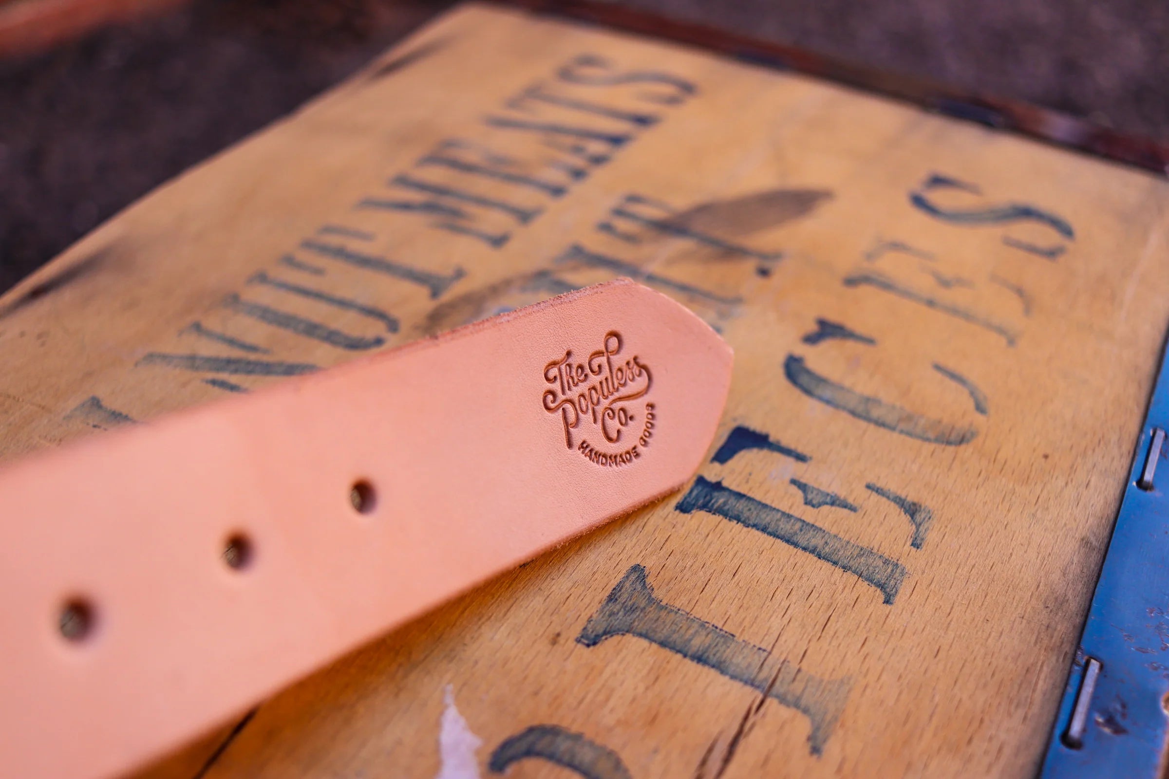 The Keho Belt 1.5" width (standard) timeless design, cut from 10/12oz Latigo Leather. There is some variance between belt thicknesses. We use a heavier weight leather so your belt will be able to handle anything you through its way. These belts have a stiff rigidity to them right away and in time with wear break in beautifully. Used for quality, durability and built for your journey. "The Populess Co." embossed on the tip. Note each piece of natural leather we use has its own characteristics and imperfection, just like the people that surround us.