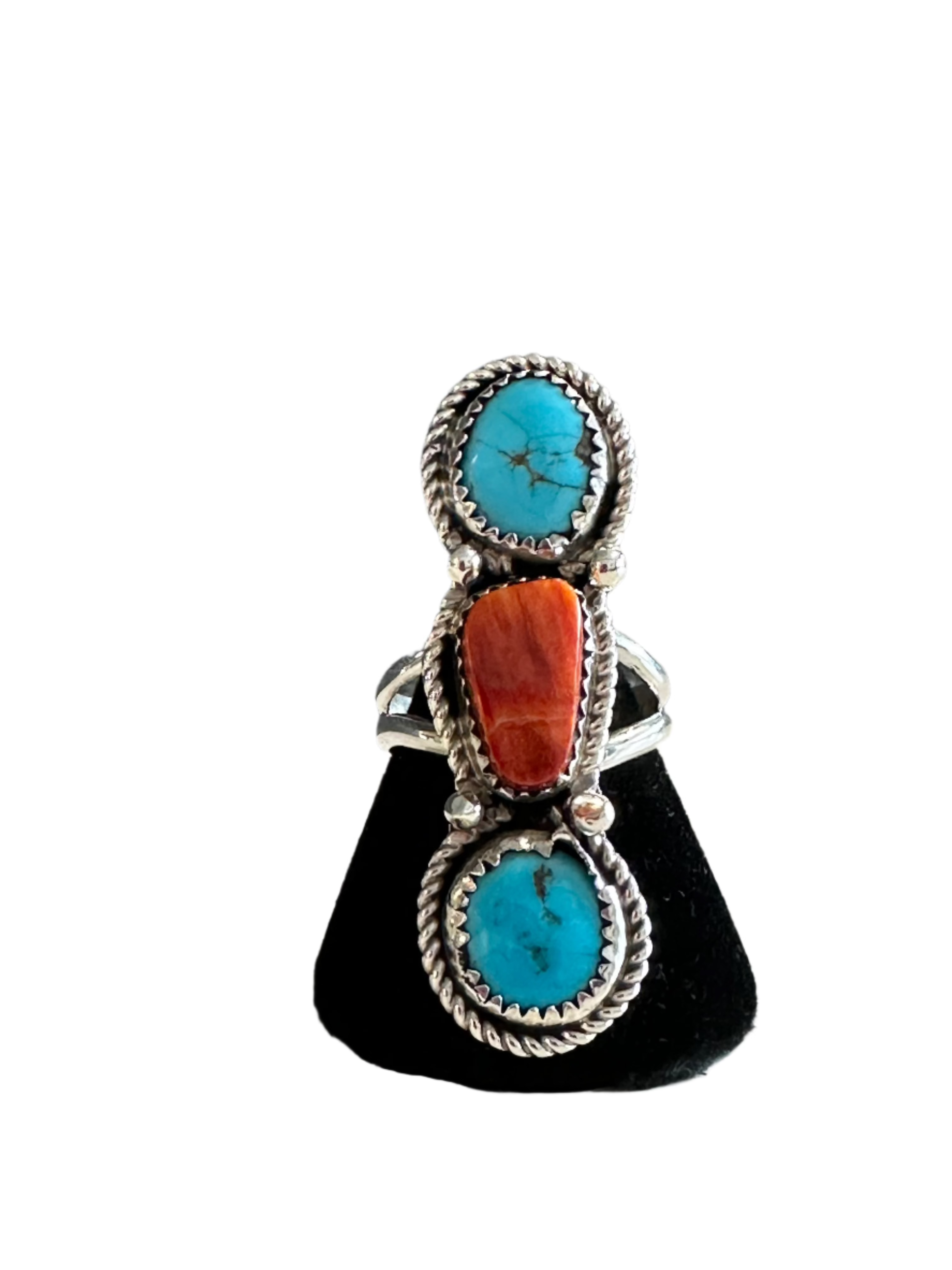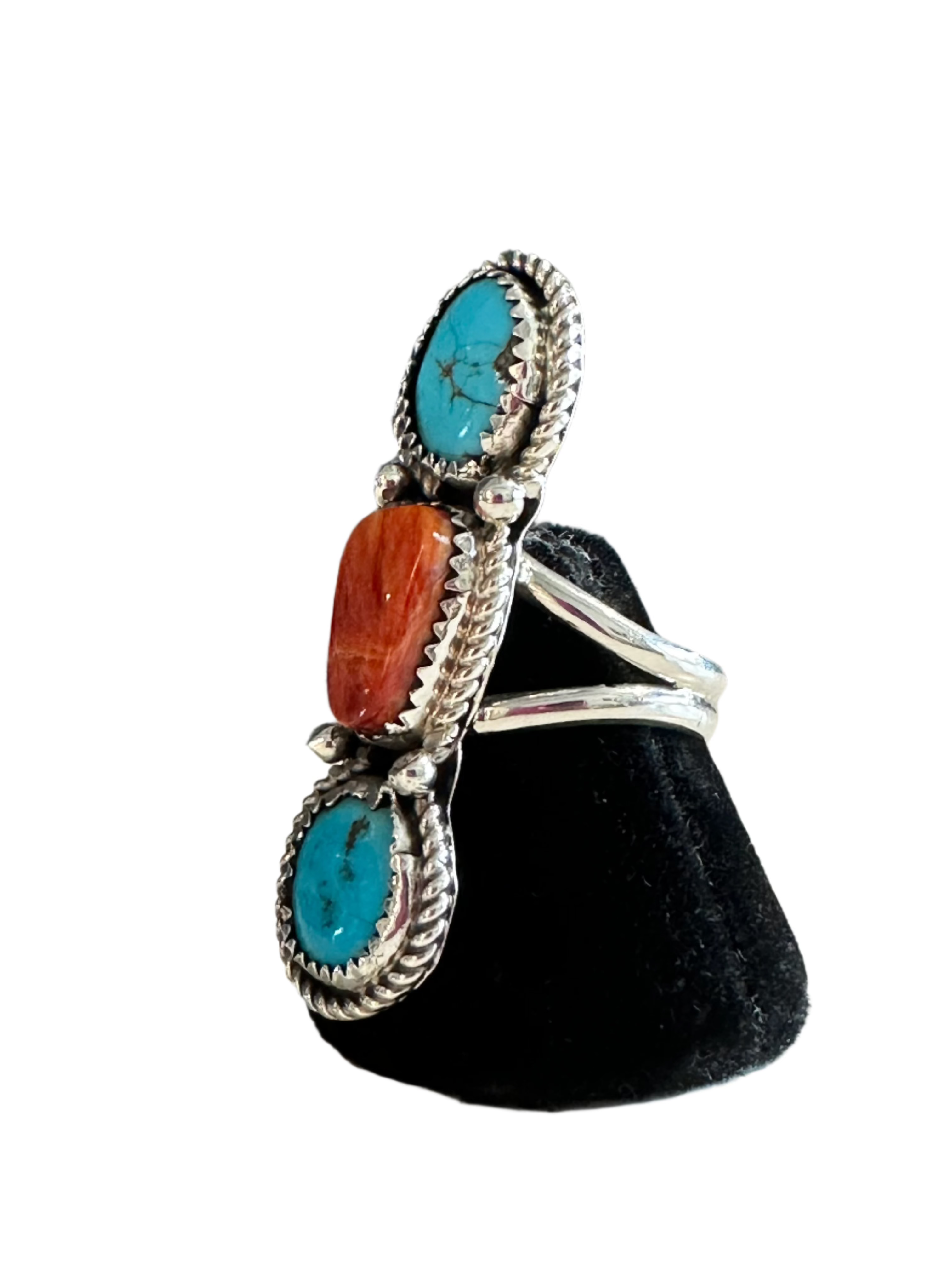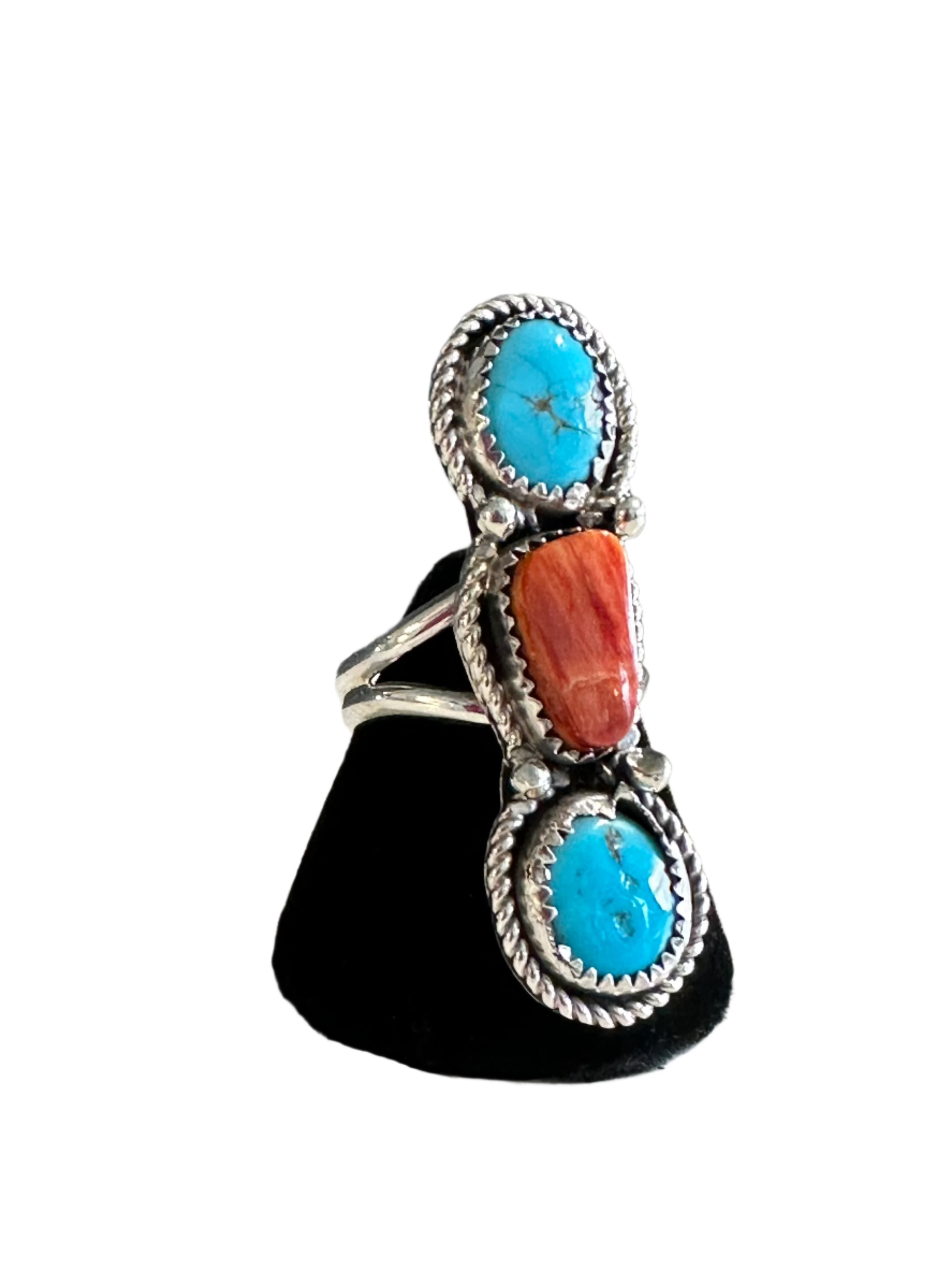 Sterling silver ring made with 2 free form Kingman turquoise stones, a center spiny oyster stone, twist wire border and drops on a double wire shank.